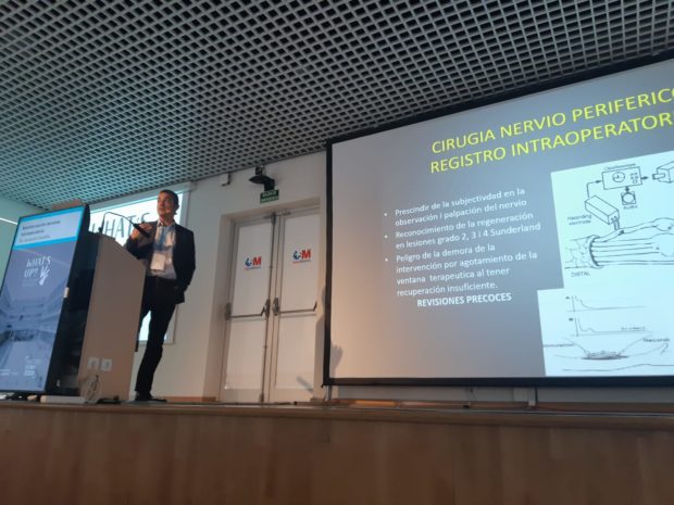 El Dr. Joaquim Casañas habló del registro electroneurográfico en lesiones de nervio periférico (monitorización nerviosa intraoperatoria) y el Dr. Pau Lopez-Osornio habló de las últimas novedades de material de osteosíntesis (implantes) de la casa comercial Medartis.