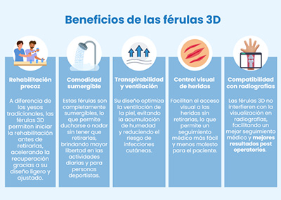 - Rehabilitación precoz: A diferencia de los yesos tradicionales, las férulas 3D permiten comenzar la rehabilitación antes de retirarlas. Gracias a su diseño ligero y ajustado, el paciente puede iniciar la terapia mientras sigue inmovilizado, acelerando así la recuperación.