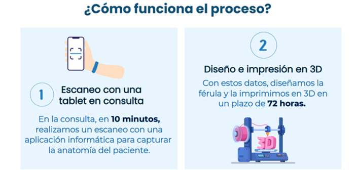 En consulta, realizamos un escaneo de la parte afectada utilizando una tablet. Este escaneo dura solo 10 minutos y captura la anatomía precisa del paciente. Con estos datos, se diseña y edita la férula, que luego se imprime en 3D en un plazo de 72 horas. El resultado es una férula ajustada a la medida del paciente, que permite una rehabilitación precoz y ofrece un confort excepcional.