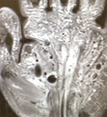 El paciente es dado de alta y evoluciona a la progresiva aparición de bultomas en palma y dorso de mano que obedecen al intento del cuerpo de coleccionar y aislar el aceite inyectado.