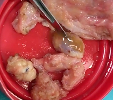 Siendo desbridado de urgencias, de aprecia intraoperatoriamente como los tejidos están embebidos de substancia oleosa. Se descomprime el nervio mediano y sus ramificaciones y se practica fascieotomía dorsal de musculatura intrínseca.