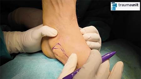 Lo marco porque luego tengo que poner un arpón aquí en el cuello del astrágalo, así que no puedo ir muy lateral, tengo que ir un poco curvo. A mí me servirá para explorar un poco la articulación y limpiar un poco los osteocitos.