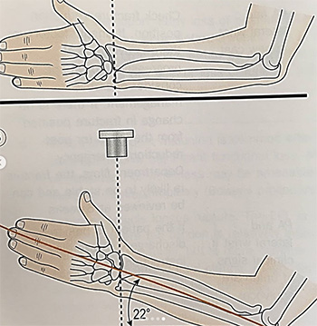 Estas dos proyecciones son sumamente útiles para evitar la lesión/irritacion del aparato extensor y la afectación yatrogénica de la articulación R-C distal cuando estamos intentando controlar el típico pequeño fragmento de la fosa semilunar.